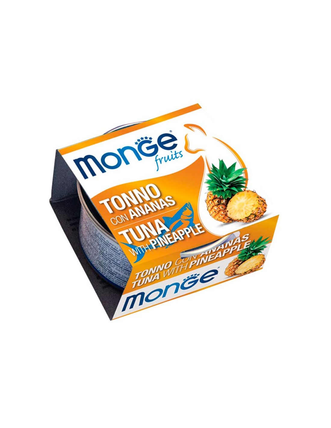 Exquisitas latas de comida húmeda para tu gato. MONGE FRUITS Atún con Piña es un alimento complementario diseñado para gatos adultos, preparado con materias primas seleccionadas por su frescura natural y elaboradas aún más sabrosas gracias a la cocción al vapor. La receta se basa en deliciosos barriletes enriquecidos con piña, fuente de vitaminas y con prebióticos fructo-oligosacáridos (F.O.S.) para el bienestar intestinal. Promueve la actividad diaria del gato adulto con un buen nivel de energía. Hecho sin colorantes y conservantes añadidos. Sin prueba de crueldad.