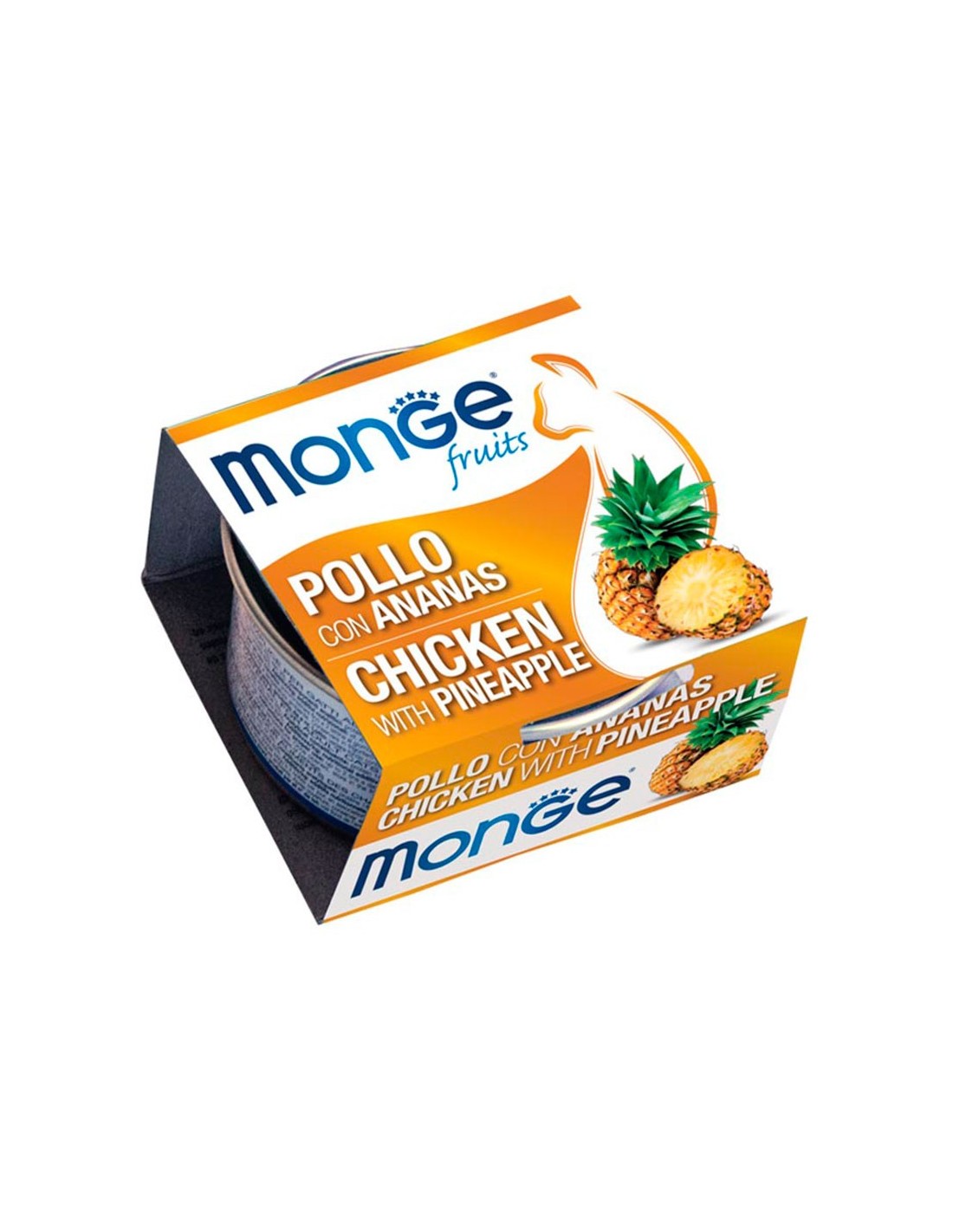 Exquisitas latas de comida húmeda para tu gato. MONGE FRUITS Pollo con Piña es un alimento complementario diseñado para gatos adultos, preparado con materias primas seleccionadas por su frescura natural y elaboradas aún más sabrosas y sabrosas gracias a la cocción al vapor. La receta se basa en una deliciosa pechuga de pollo enriquecida con piña, fuente de vitaminas y con prebióticos fructo-oligosacáridos (F.O.S.) para el bienestar intestinal. Promueve la actividad diaria del gato adulto con un buen nivel de energía. Hecho sin colorantes y conservantes añadidos. Sin prueba de crueldad.