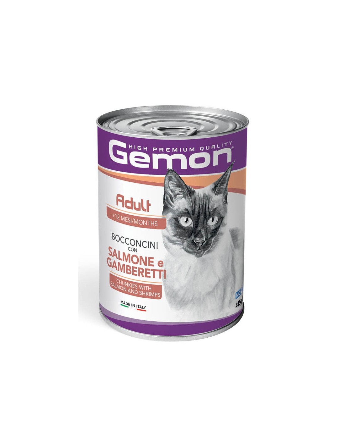 GEMON Bocados con Salmón y Gambas es un alimento completo para gatos adultos, formulado para aportar todos los nutrientes necesarios para la vitalidad diaria de nuestros amigos de cuatro patas.