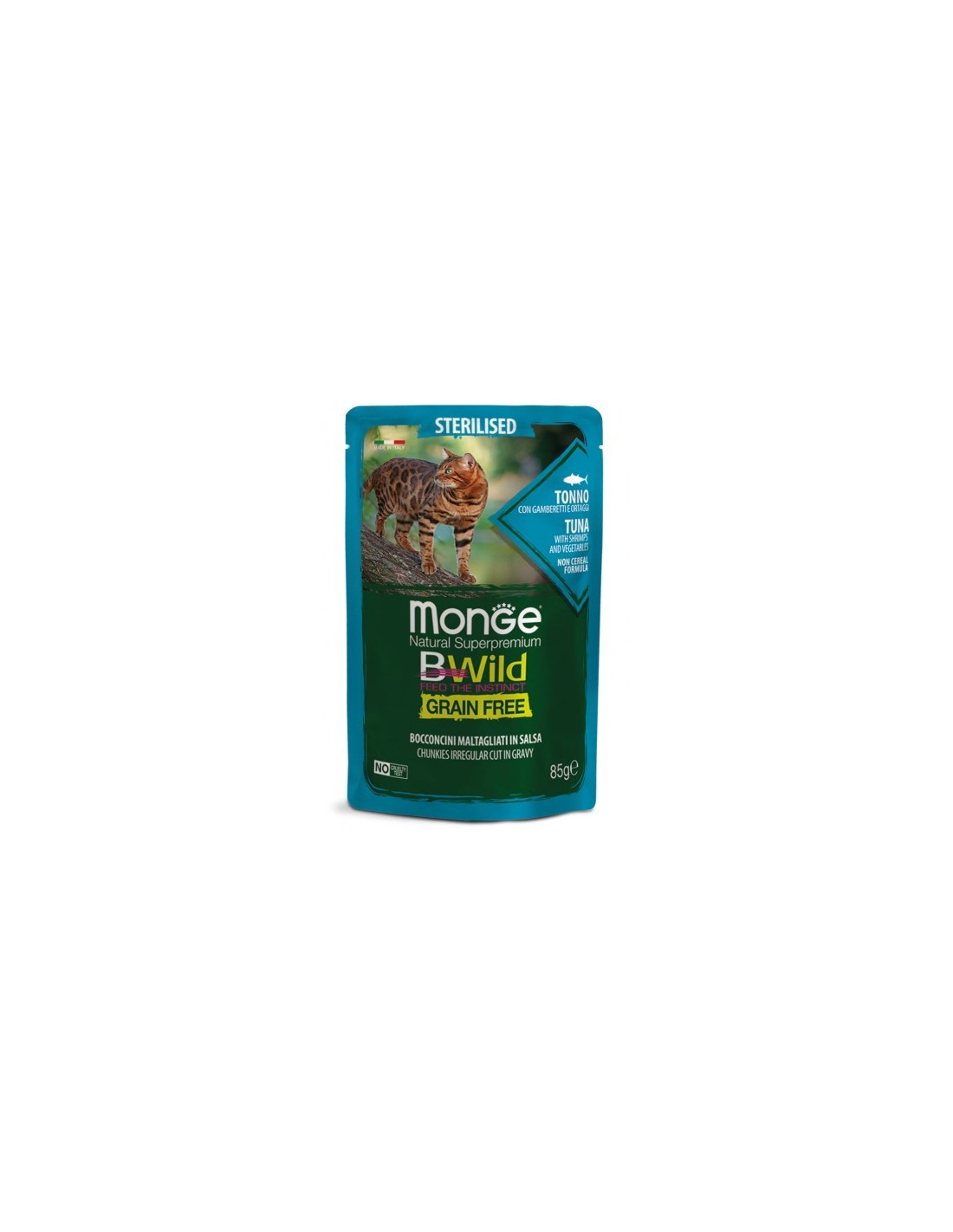 Monge Natural Super Premium Bwild Grain Free Formula para gato esterilizado, Sobres de 85 gr. formulado a base de Atún con camarones y verduras (judías verdes y zanahorias) es un alimento completo y equilibrado para gatos adultos esterilizados. Formulado pensando en el bienestar de los gatos esterilizados, gracias al aumento de la ingesta de fibra y a una ingesta reducida de grasas para favorecer el mantenimiento de una escasa forma física. La receta está enriquecida con camarones, fuente de proteínas de alto valor biológico, y con los xilo-oligosacáridos prebióticos (XOS) de última generación para apoyar el bienestar intestinal. Contiene yuca schidigera para el control del olor de las heces.