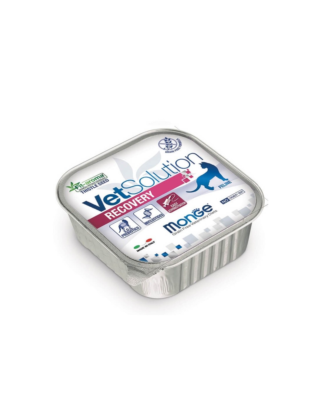 MONGE VETSOLUTION RECOVERY FELINE es un alimento dietético completo para gatos formulado para favorecer la recuperación nutricional durante la convalecencia. Contiene nucleótidos para apoyar el sistema inmunológico, cardo mariano para apoyar la convalecencia, xilooligosacáridos (XOS) para preservar la microbiota intestinal. La formulación se caracteriza por una alta densidad energética, altas concentraciones de nutrientes esenciales e ingredientes altamente digestibles.