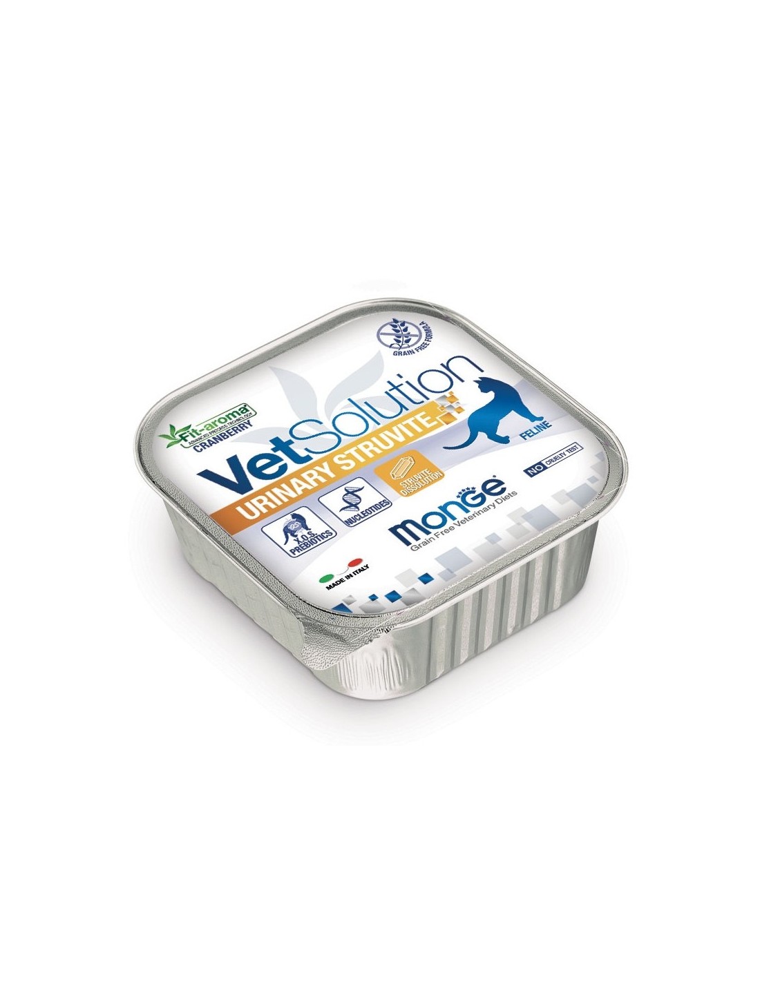 Cuida tu gato con MONGE VETSOLUTION URINARY STRUVITE para Gatos. Se trata de un alimento dietético completo para gatos formulado para la disolución de cálculos a base de estruvita, para la reducción de recurrencias de cálculos de estruvita y para el síndrome urológico de felinos, FUS.