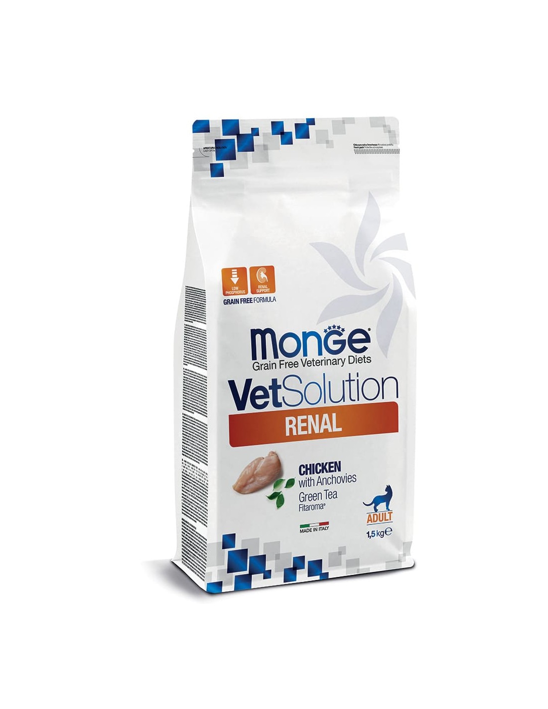 Monge VetSolution Renal Gatos contiene Super Oxide Dismutase (SOD) para prevenir el estrés oxidativo, extracto de té verde con propiedades antioxidantes y antiinflamatorias, xilo-oligosacáridos para asegurar la microbiota intestinal y la fórmula se caracteriza por un bajo nivel de fósforo y un nivel restringido De proteína pero de alta calidad.
