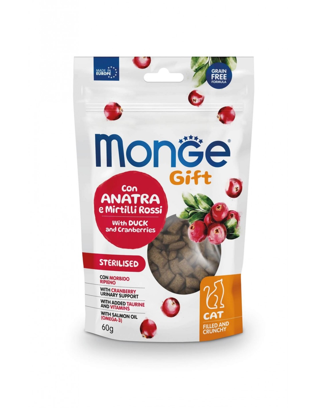 MONGE GIFT Gato Esterilizado con Pato y Arándanos es un alimento complementario para gatos adultos esterilizados. Específicamente desarrollado para el bienestar de su gato gracias al exterior crujiente para apoyar la higiene dental y un suave relleno de arándano para el tracto urinario. Producto formulado sin cereales y con pato para una óptima palatabilidad y digestibilidad. La formulación está enriquecida con taurina para apoyar la visión y el funcionamiento cardíaco normal y con vitaminas para la vitalidad diaria. La inclusión de ingredientes funcionales como los arándanos para el apoyo fisiológico del tracto urinario, la levadura de cerveza para el sistema inmunológico y el aceite de salmón, fuente de ácidos grasos omega-3, es el resultado de la investigación Made in Italy. Sin conservantes artificiales ni azúcares añadidos.