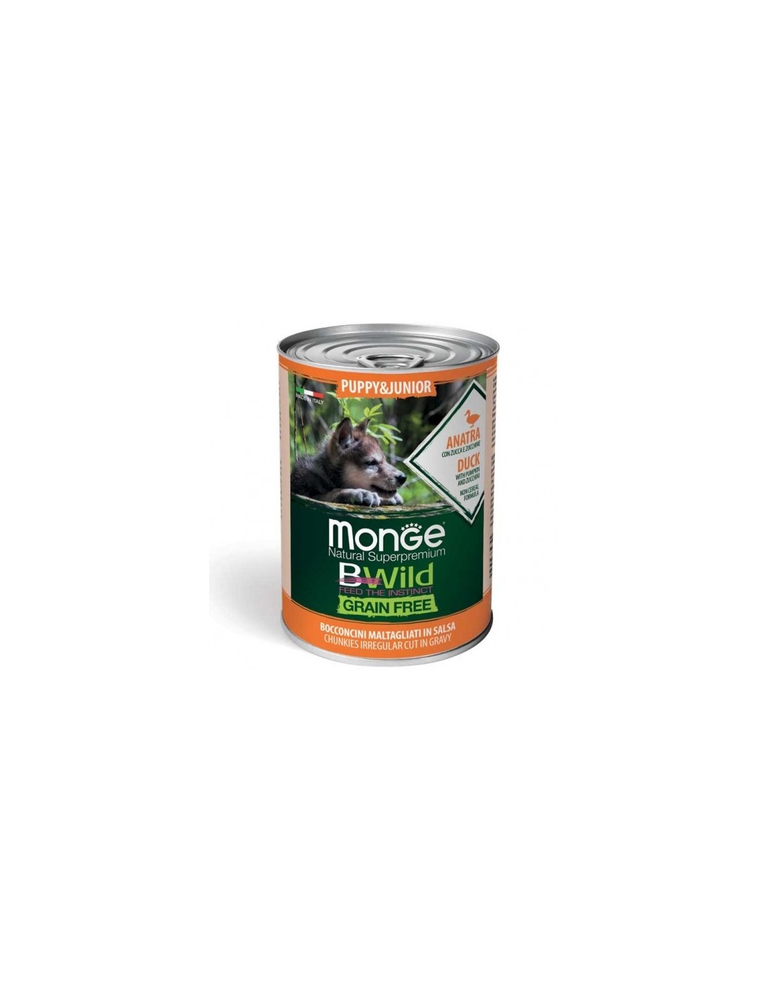 Deliciosas Latas para tu Cachorro. Monge Natural Super Premium Bwild Grain Free Formula Perro Puppy & Junior de Pato con calabaza y calabacín es un alimento completo y equilibrado para perros cachorros desde 1 mes hasta llegar a la edad adulta. La receta está enriquecida con la última generación de xilo-oligosacáridos prebióticos (XOS) para apoyar el bienestar intestinal. La formulación apoya el correcto crecimiento de las articulaciones, gracias a la inclusión de glucosamina y sulfato de condroitina y una relación equilibrada calcio/fósforo. Apto para cachorros de todos los tamaños.