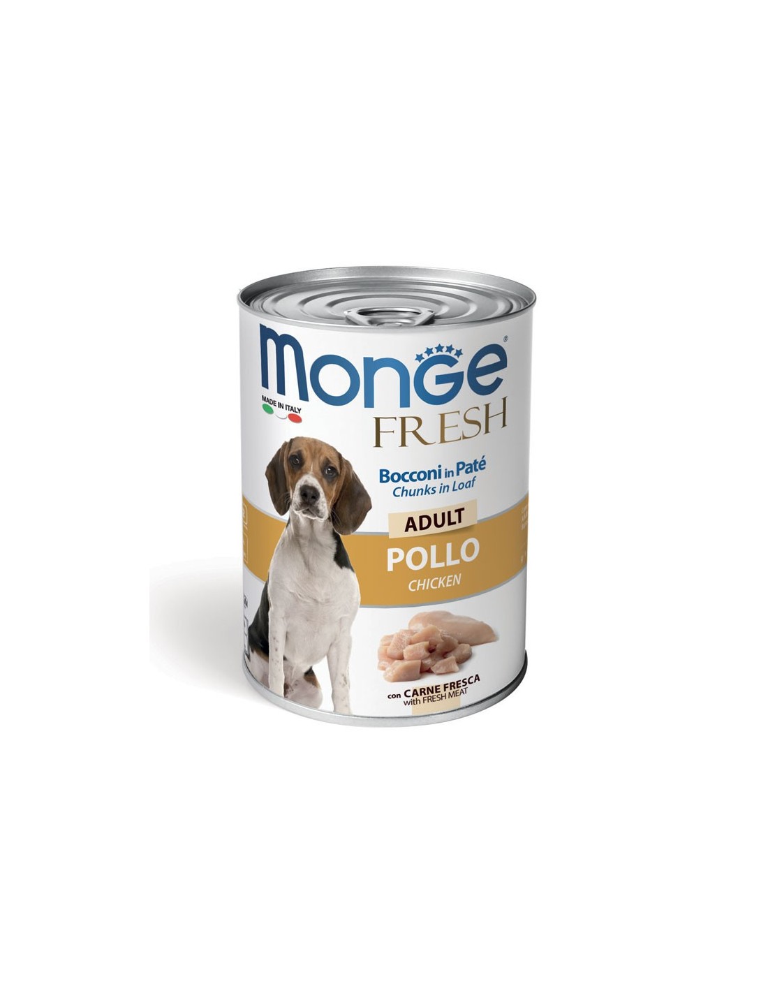 Delicioso Paté Fresco a base de Pollo. Monge Fresh bocados en paté de pollo es un alimento completo y equilibrado para el cuidado de perros adultos. El procesamiento al vapor caliente de la carne fresca de pollo garantiza una alta digestibilidad, así como el alto valor biológico de la receta.