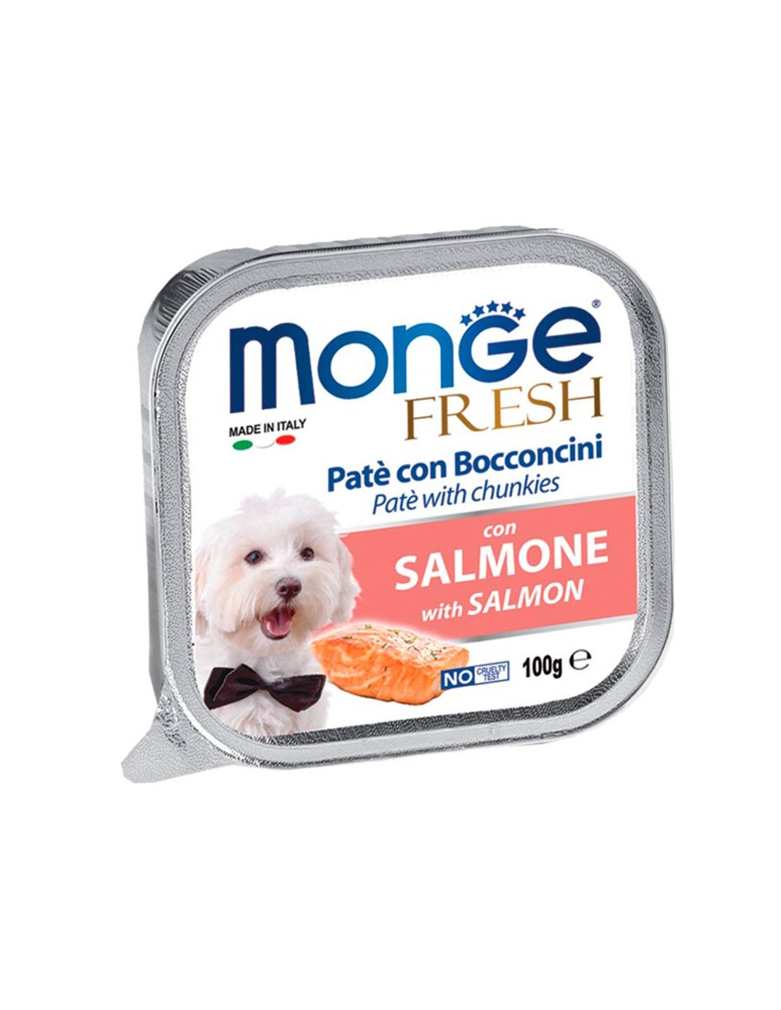 El delicioso paté con deliciosos bocados de salmón fresco es un alimento completo seleccionado para apoyar el bienestar diario de tu mascota todos los días. La receta ha sido formulada con un bajo contenido en azúcar y sin grasas hidrogenadas. El sabroso y suave paté con bocados es ideal para perros pequeños y como recompensa para perros más grandes. Monge Fresh es Made in Italy, No Cruelty Test y sin colorantes ni conservantes.