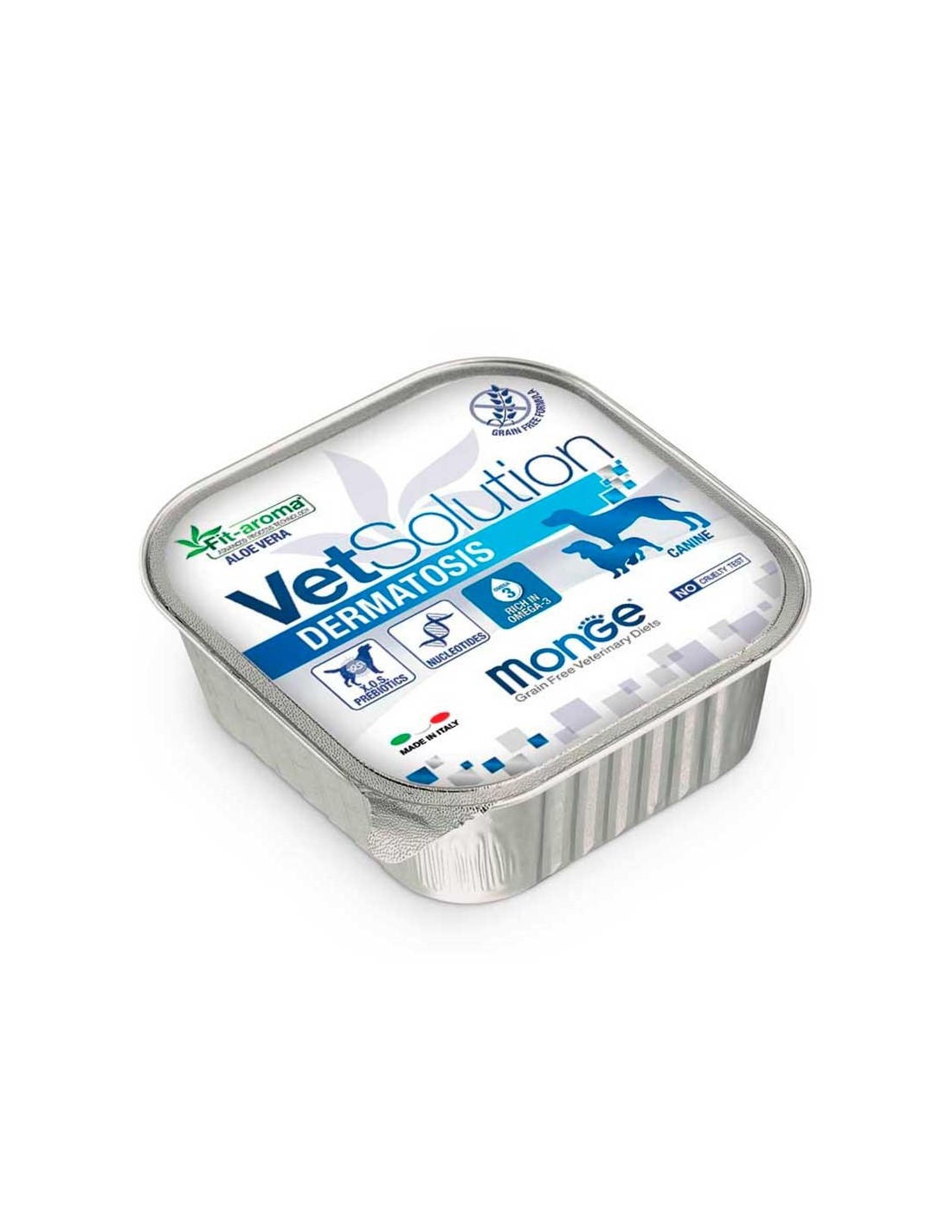 Las tarrinas MONGE VETSOLUTION DERMATOSIS CANINE contienen un alimento dietético para mascotas, completo para perros, formulado para apoyar la función de la piel en el caso de la dermatosis y la pérdida excesiva de cabello. Contiene nucleótidos para respaldar el sistema inmunológico, Aloe vera para respaldar la piel, PreBioticos xilo-oligosacáridos (XOS) para asegurar la microbiota intestinal y un alto nivel de ácidos grasos esenciales.
